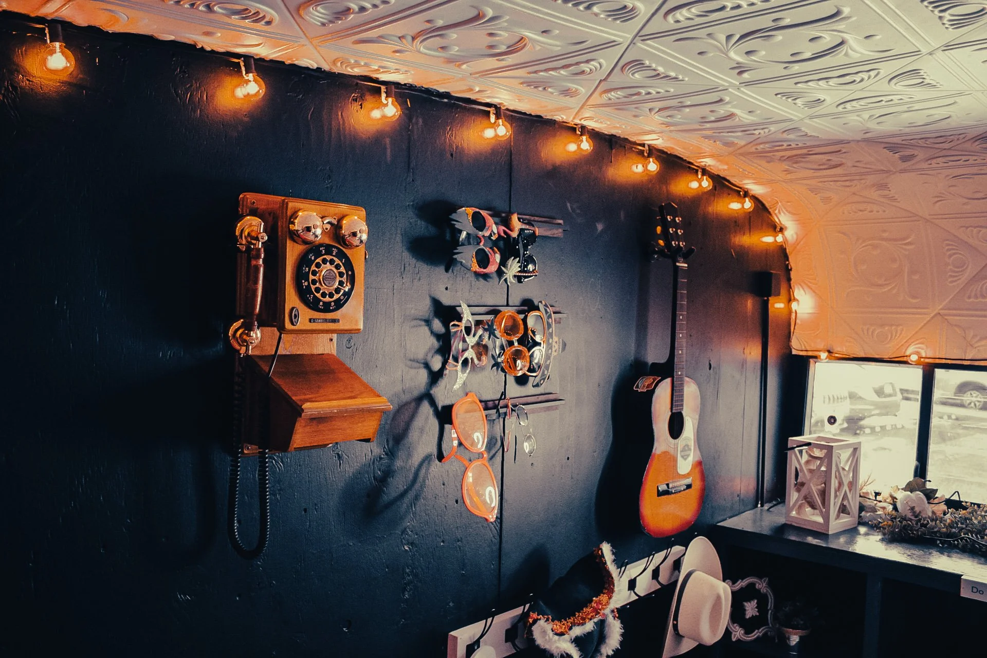 Inside she’s set up with a plethora of funny, laughable, masks, hats, props, signs and wigs. She can also be dressed up with exterior signs, furniture, tables, round bulb lighting, theming and more.